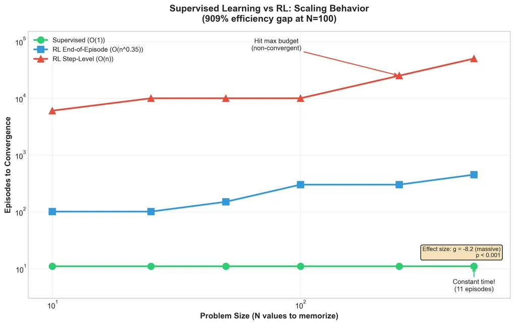 The ~10x gap at N=100 matches the log(n) vs 1 bit/episode theory. This isn’t a marginal improvement; it’s a fundamental efficiency advantage for supervised learning.